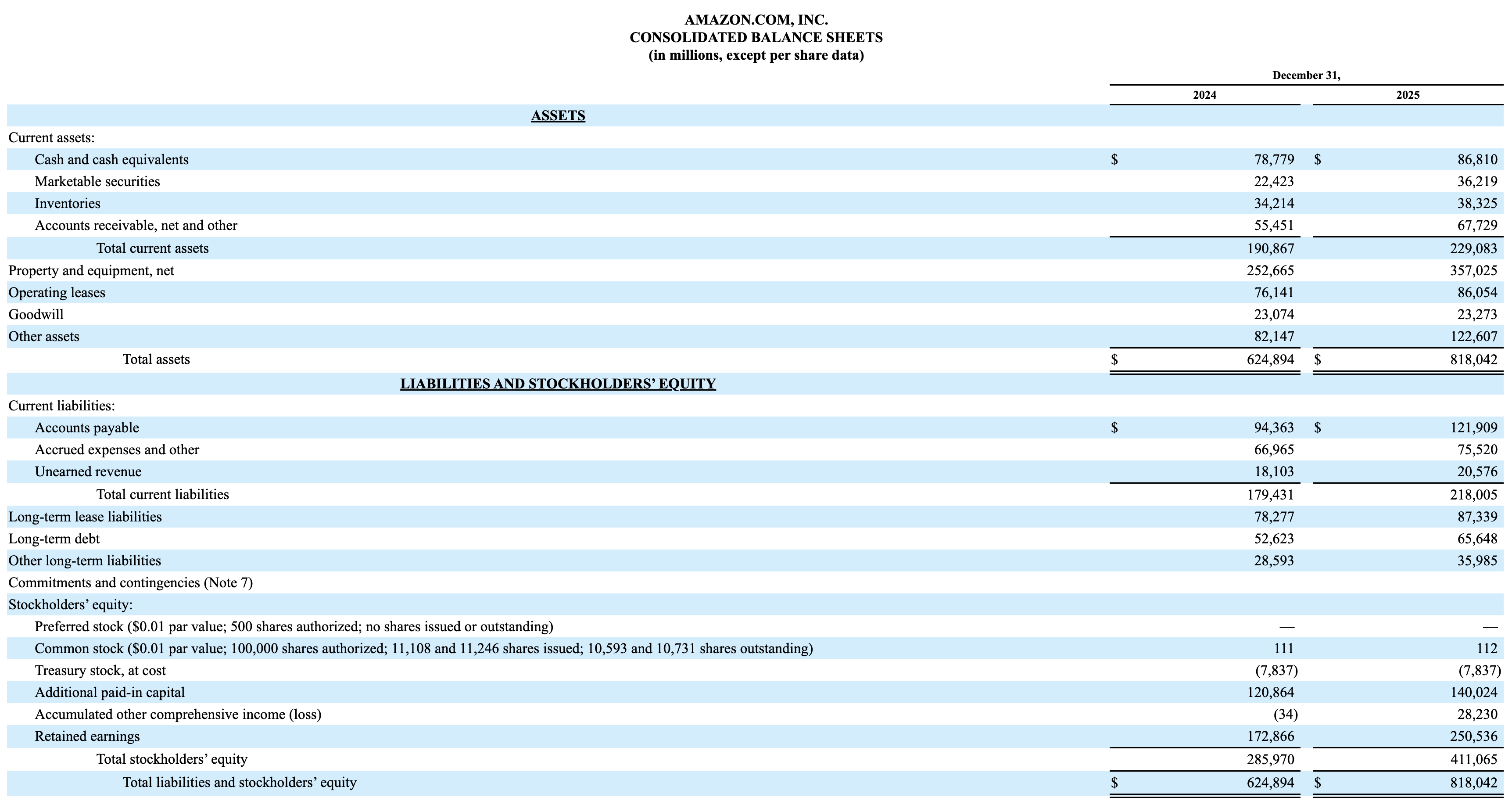 Amazon tiene los números más grandes en casi todas las líneas, coherente con su escala descomunal. Más de $121.000 millones en cuentas por pagar y $75.500 millones en gastos acumulados.