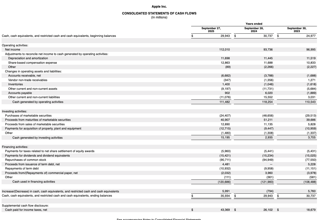 Apple tiene un CFO casi igual al Net Income en 2025. Interesante, porque en 2024 el ratio había sido 1,26 ($118.254M de CFO vs $93.736M de NI). La diferencia este año viene principalmente por movimientos grandes en otros pasivos corrientes y no corrientes que restaron al Working Capital. Es la clase de detalle que vale la pena investigar en las notas del 10-K si querés profundizar.