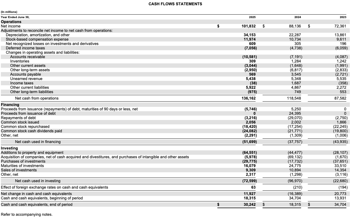 Microsoft reportó $34.153M en D&A en el año fiscal 2025. Es un número enorme: más de $34 mil millones de gasto contable que no salieron en efectivo. ¿De dónde sale? De los data centers de Azure, de los edificios, de los intangibles adquiridos (como LinkedIn o Activision). Cada año, una porción del costo de esos activos se convierte en “gasto” en el Income Statement, pero es cuota contable, no cash.
